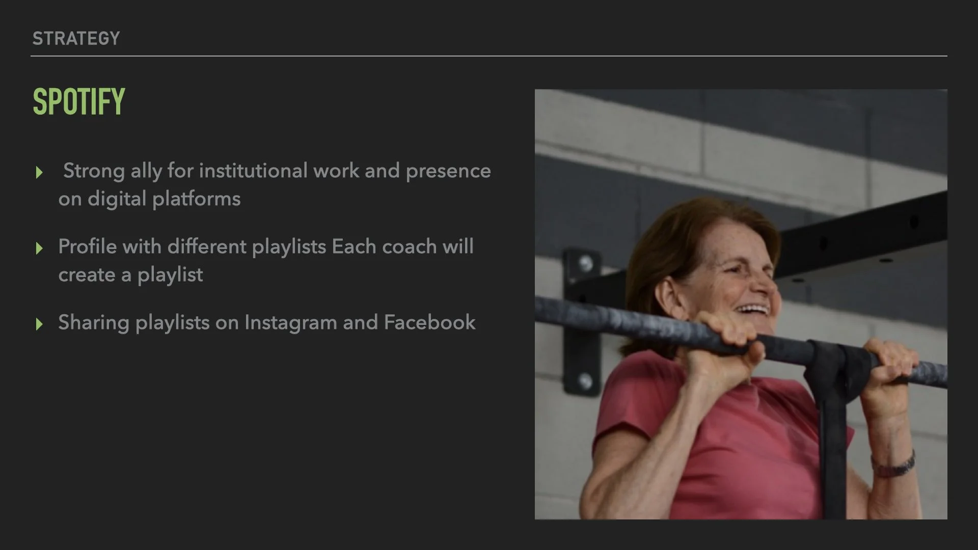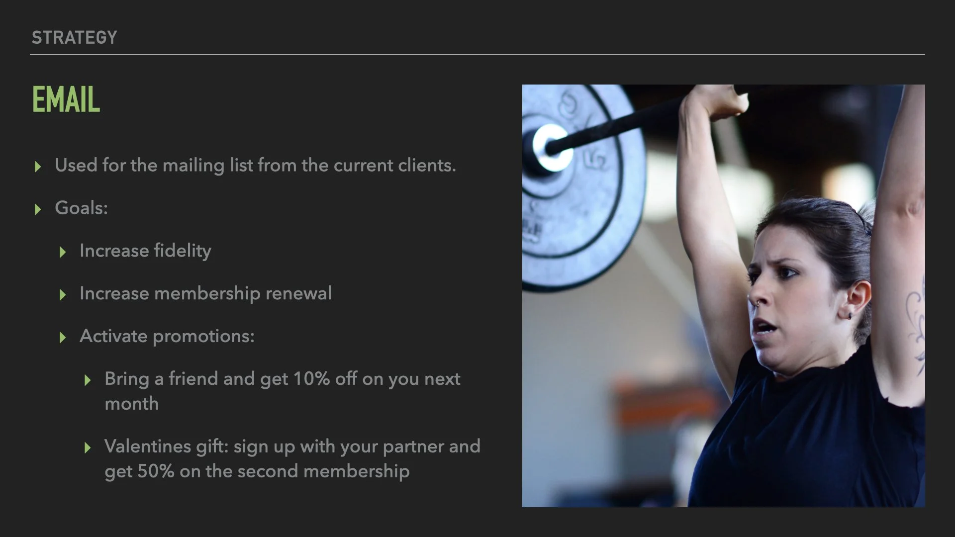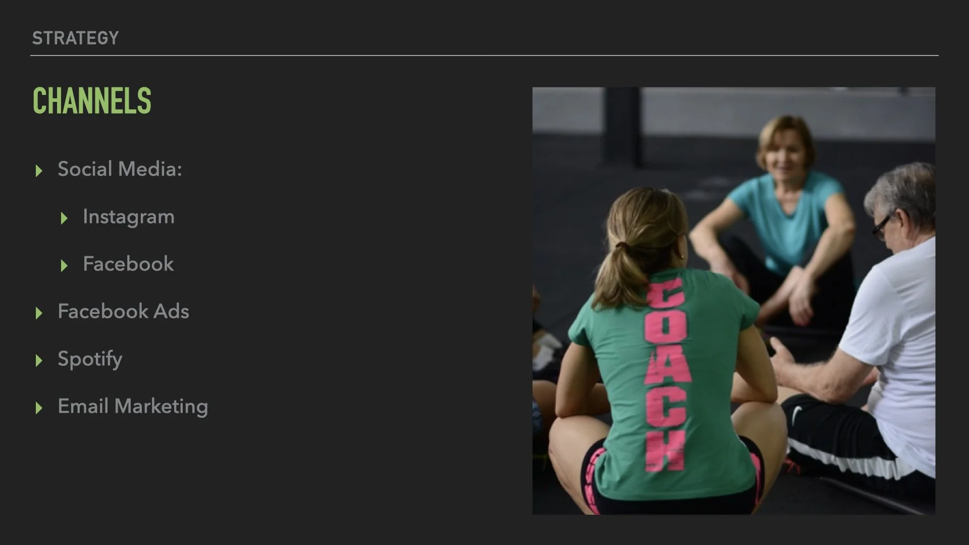 The gym had just been inaugurated and had no digital presence. This strategy was developed to start their presence in social media channels generating brand awareness and creating a digital community. For this strategy were considered Facebook, Instagram, email marketing, Spotify, and Facebook Ads.